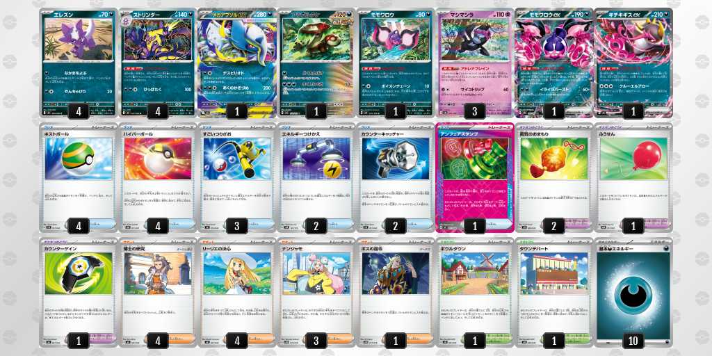 加えて、「メガアブソルex」と「アンフェアスタンプ」や「モモワロウ」のような相手の動きを止める事が出来るギミックも入っており多彩な戦術で対戦する事が可能です。