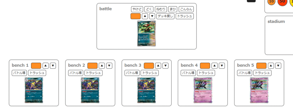 基本的にHPが高いポケモンが多いためソルロックで倒されにくく、サーフゴーexで途中からサイドを取る形になると思います。サーフゴーexに対しては、アラブルタケのワザ+アドレナブレイン50ダメージが必要となるので回し方の所に載せた盤面を目指します。