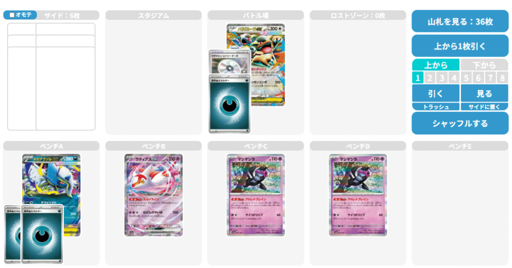 理想の序盤展開はメガガルーラex、メガアブソルex、ラティアスex、マシマシラ×2体。残り1枠は対面によってコダックやイベルタル、3体目のマシマシラなどを展開します。