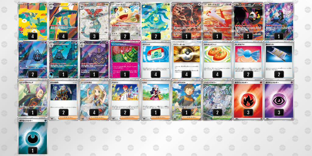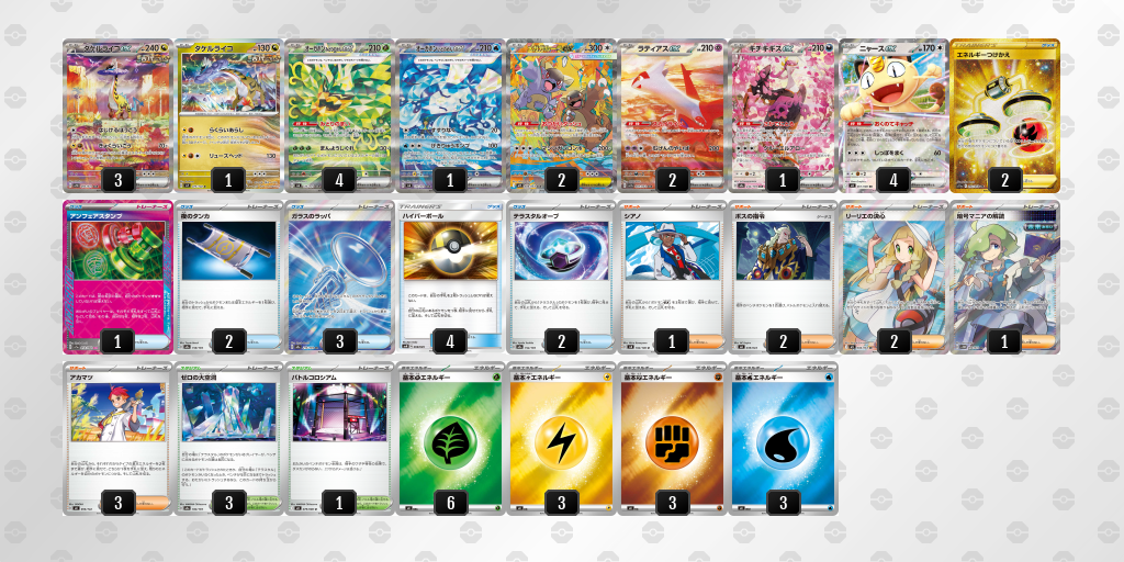 選択肢が多いということはいろいろなデッキに対して戦えるということであるので、ドラパルトexを除けばそれ以外は雑多環境と言ってもいいこの環境に生き残っていけるデッキだと考えています。