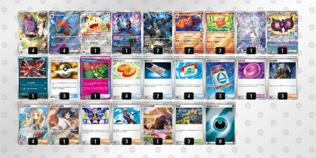 なかよしポフィンとポケパッドを4枚づつ採用することで、Nのゾロアークexに進化する安定感、そしてわざナイトジョーカーで技を使うためにベンチに出さなければいけないポケモンを出す安定感を意識しています。