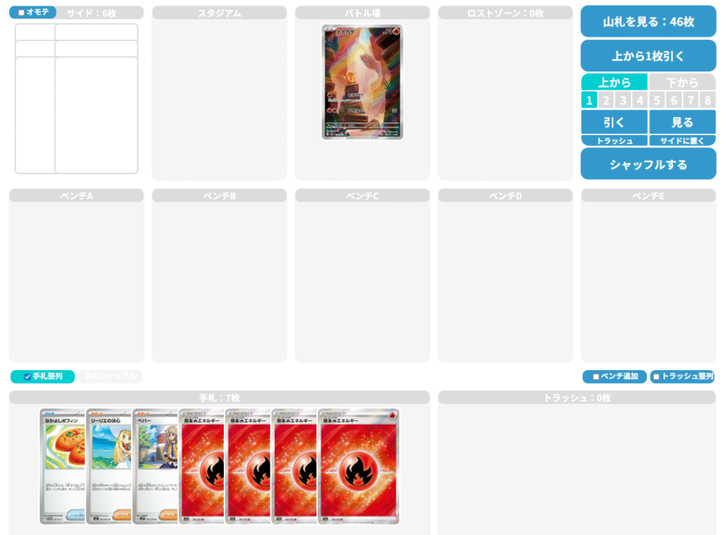 つまり「ベンチにポッポとヒトカゲを並べ、バトル場のポケモンにエネルギーとエヴォリューションをつける」ことが、このターンの具体的な目標になります。