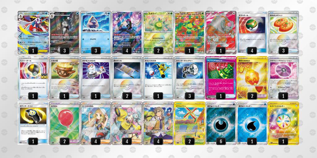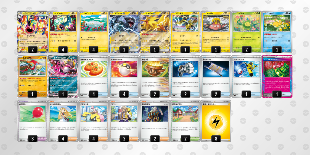 メガシビルドンexのワザを強力に使える構築にしてみました。コンセプトは序盤はスボミーのむずむずかふんを使いながら盤面を整えていき、盤面が出来上がり次第、ワザのディザスターショック+手札干渉で相手のバトルポケモンをマヒで攻撃出来ないようにし、ダメージを蓄えたポケモンをばくれつだんでまとめて取るという所を意識しています。また、ルチャブルの特性フライングエントリーでダメカンを10ダメージずつばら撒く事で、ばくれつだんでHP70のポケモンを2体倒すプランやばくれつだんのダメージが足りない場合はサンダーexのワザいなずまれんだんで火力を補う事も可能です。まとめ取りが厳しい相手にはゼクロムexやゼラオラを中心に戦う事も出来き幅広い戦術で戦えるのが魅力的なデッキとなっています。