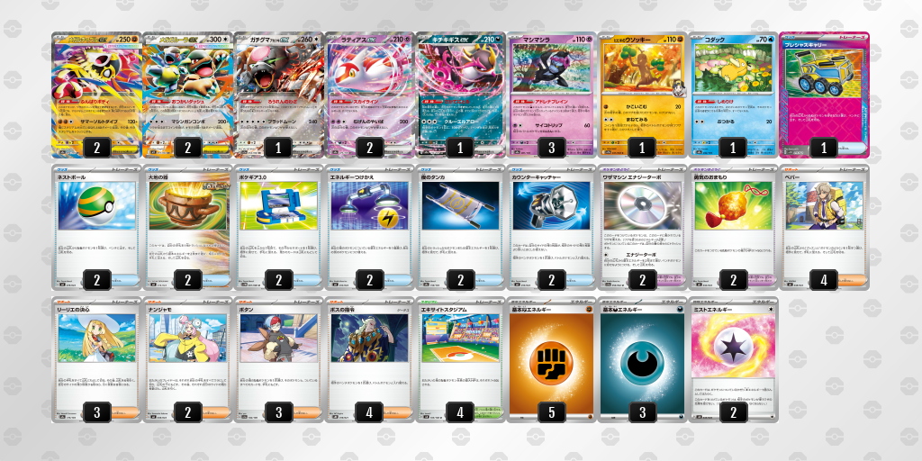 メガルチャブルexは特性のふんばりボディを持っており、ワザのダメージを受けてきぜつした場合、コインがオモテだと残りHP10の状態で場に残る特性を持っています。そのため、コインがオモテであり続ける限り無敵状態を保てますが、欠点として残りHP10で残った場合、マシマシラの特性アドレナブレインやヨノワールの特性カースドボムなどで倒される事や、ワザの効果できぜつした場合は特性が働かない事などがあげられます。その欠点を補うカードを今回は相方として採用しました。一つ目がマシマシラです。HPが10の状態で残った場合は特性のアドレナブレインを使いHPを回復しつつワザのダメージを上昇させる事が出来る為相性が良いカードになっています。また勇気のおまもりやエキサイトスタジアムを採用しHPを底上げする事で簡単に倒されないようにしたり、ワザの効果できぜつを狙う相手に対してはミストエネルギーを貼る事でワザの効果を受けなくする事も出来るので、コイントスに必ず持ち込めるようになるのもポイントです。