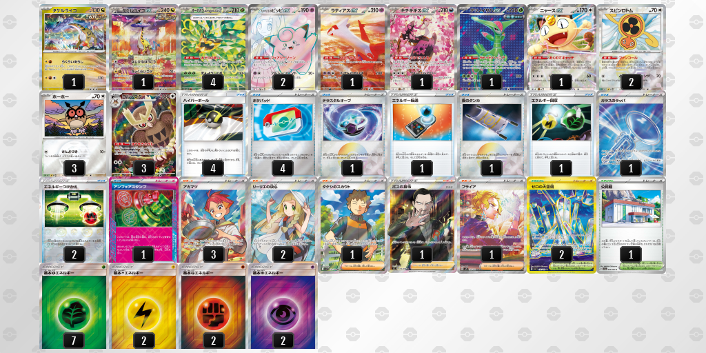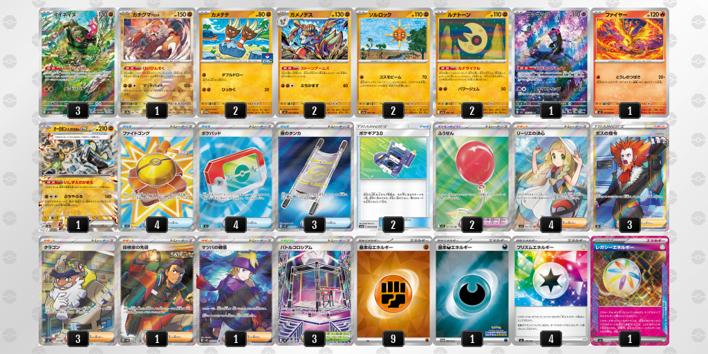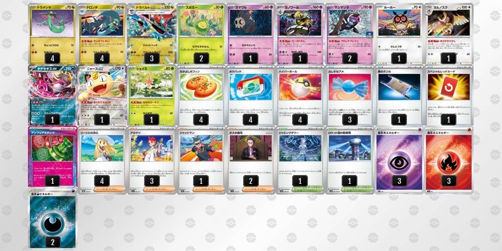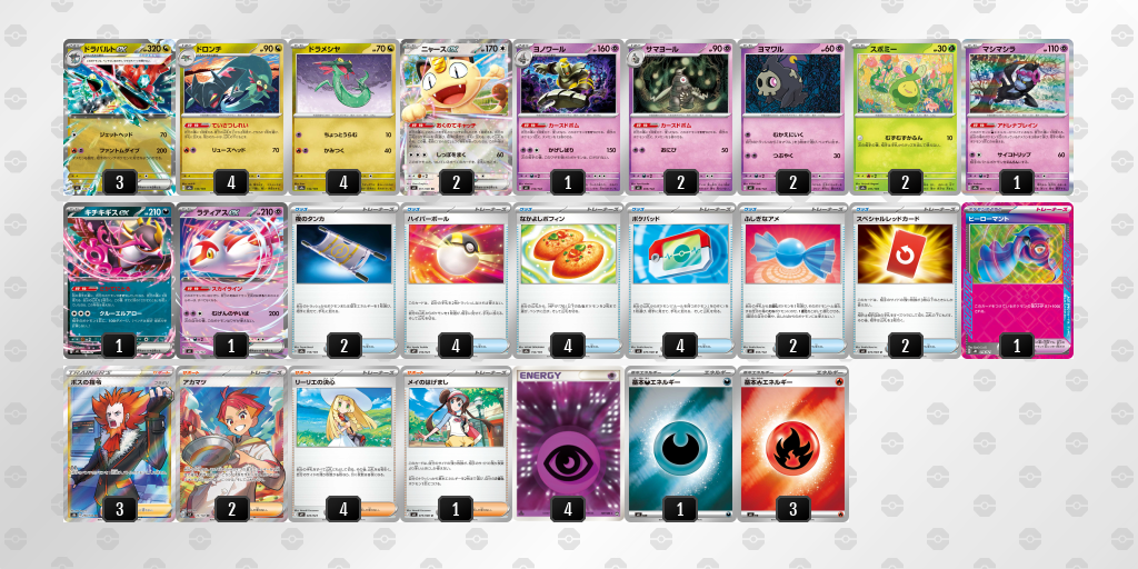 早い段階からドラパルトexのジェットヘッドでメガガルーラexを削るところから始まった試合で、そこからリーリエのピッピexでドラパルトexを倒され、ファントムダイブの返しにも返される試合展開