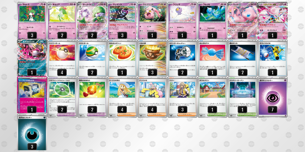 サーナイトデッキとは、サーナイトexの特性:サイコエンブレイズを使ってトラッシュから基本超エネルギーを自分の超ポケモンに加速して様々な超タイプのアタッカーを駆使して戦っていくミッドレンジのデッキです。
