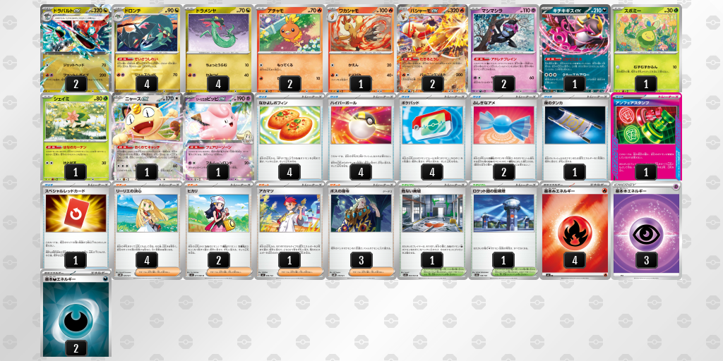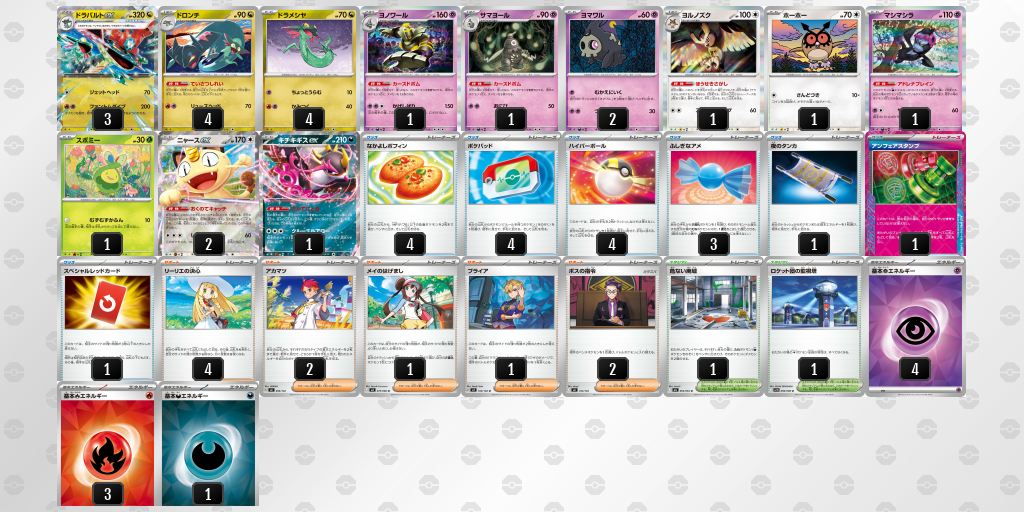 1,2ターン目を準備のターンとし、攻撃のタイミングでロケット団の監視塔+アンフェアスタンプにより行動を大きく制限しながらドラパルトファントムダイブで攻めてくるのが大きな特徴。