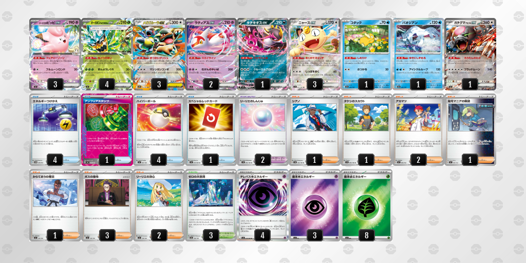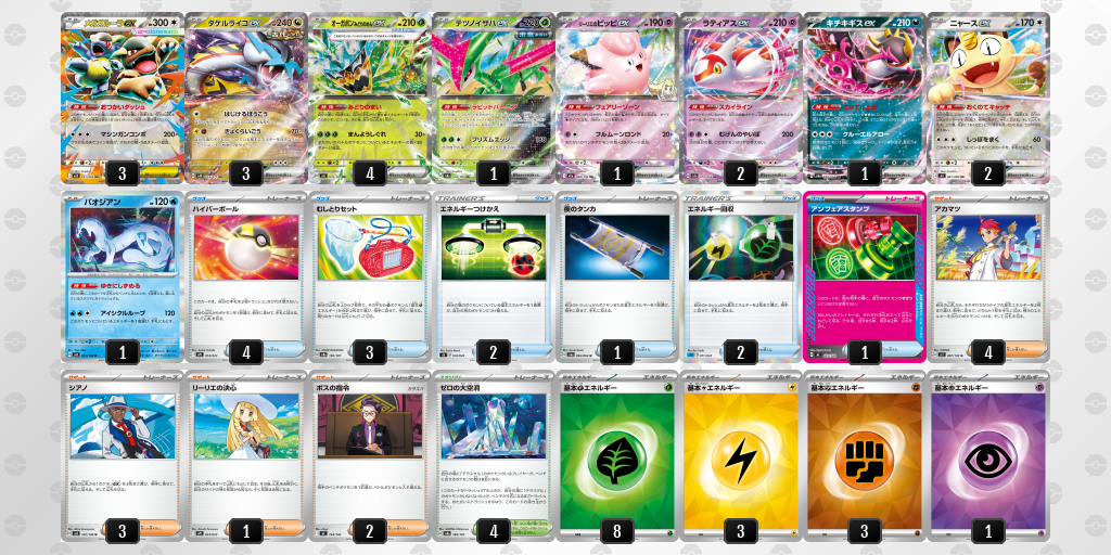 また、たねexデッキはポケモンを触るグッズがほぼハイパーボールしかなくサポート権でシアノ等により無理矢理盤面を作るターンを要求される事も多いが、ピッピオーガポンであればテレパス超エネルギーによってピッピとラティアスの供給が可能となっており実質的にボールを追加4枚採用出来ている点が非常に優秀である。