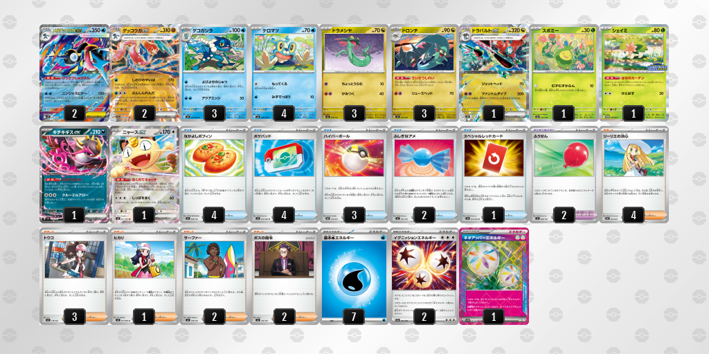 メインはゲッコウガ2種+ドロンチギミックである事が大きく、ゲッコウガが動くための展開補助としてのドローシステムのドロンチのおまけというには強力過ぎるサブアタッカーのドラパルトが搭載されている形。