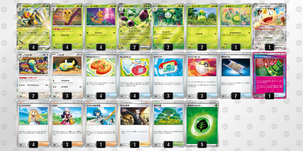 このデッキの特徴としてはアタッカーがスピアーとオリーヴァの2軸で構成されている点で、序盤のオリーヴァで進化元の非ルールを倒したり削りを入れていきながらスピアーラインを手札にかき集め、最終的にスピアーexを盤面に3体~4体立てて高耐久のポケモンまで倒せるようにしていくのが特徴。